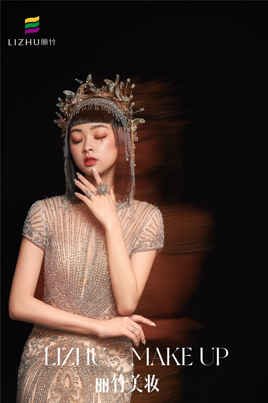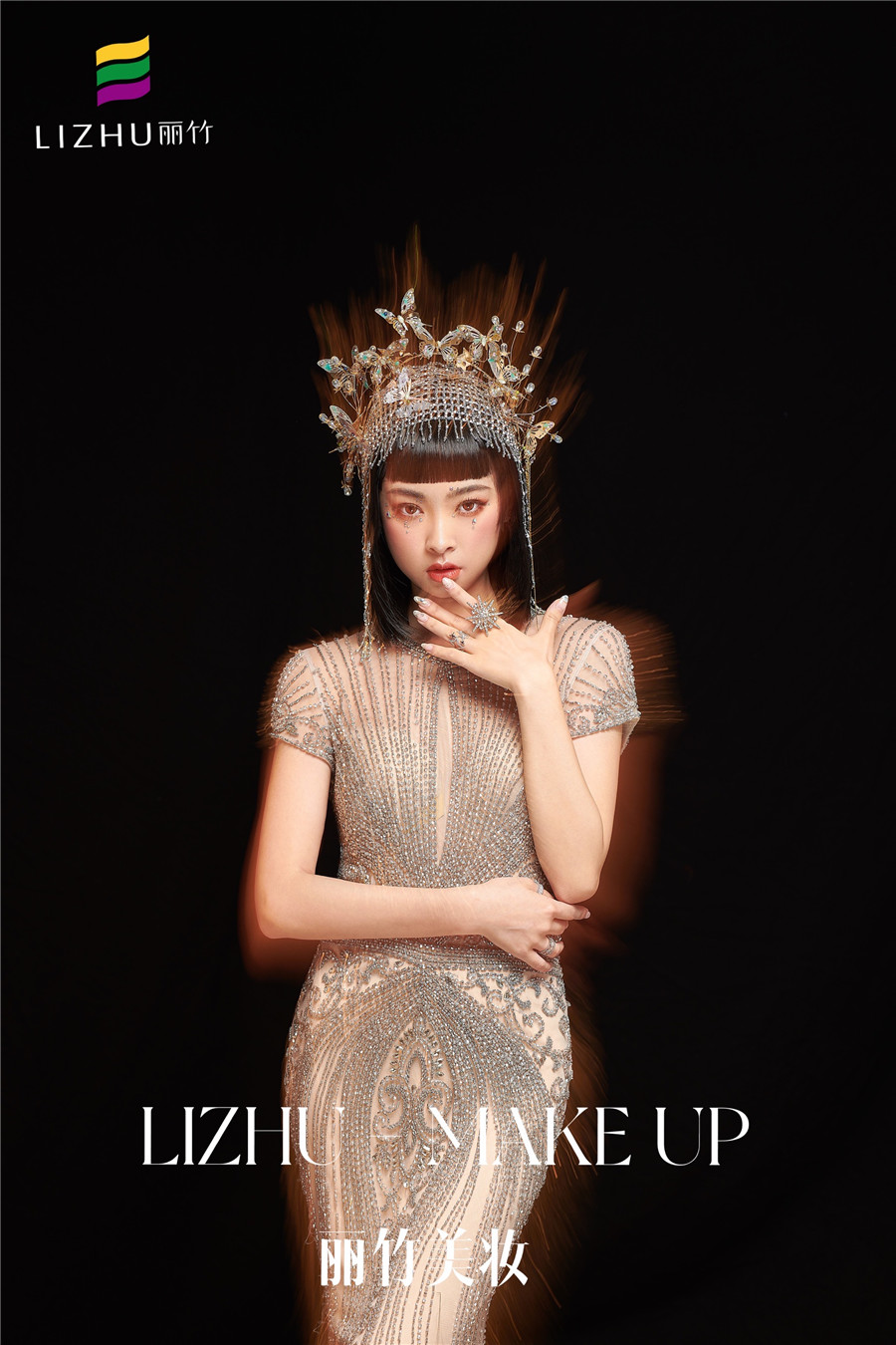 麗竹化妝學(xué)校作品---輕奢復(fù)古造型:奢華透視薄紗款禮服,勾勒出婀娜曼妙的身姿,頭飾與服飾滿鉆的鑲嵌,閃爍波光粼粼的神秘感,如夢如幻間與現(xiàn)實(shí)交替。