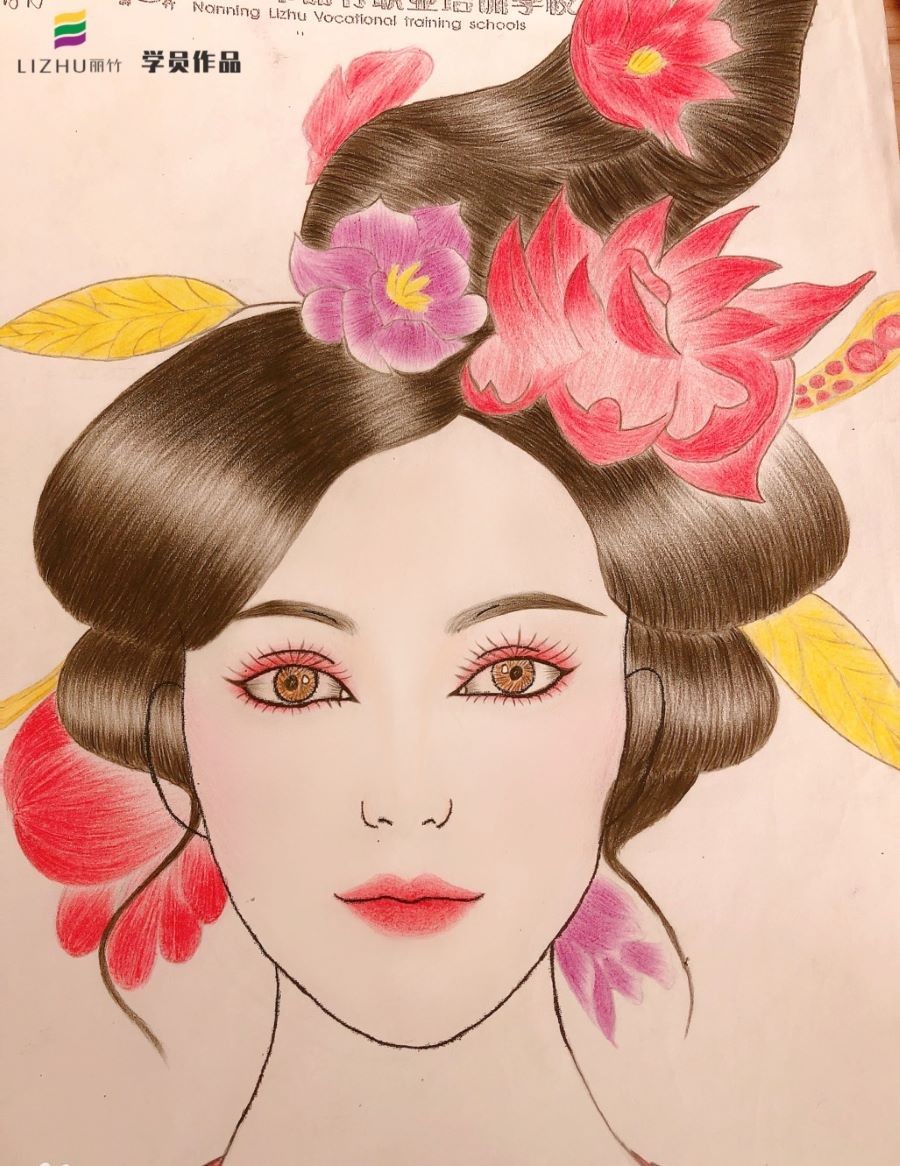 以上就是廣西化妝培訓(xùn)班學(xué)員們的部分作品,在進(jìn)行真人實(shí)操練習(xí)前,為了讓學(xué)員們可以更好掌握整個(gè)妝面以及造型的搭配,紙妝練習(xí)是不可缺少的重要學(xué)習(xí)步驟。