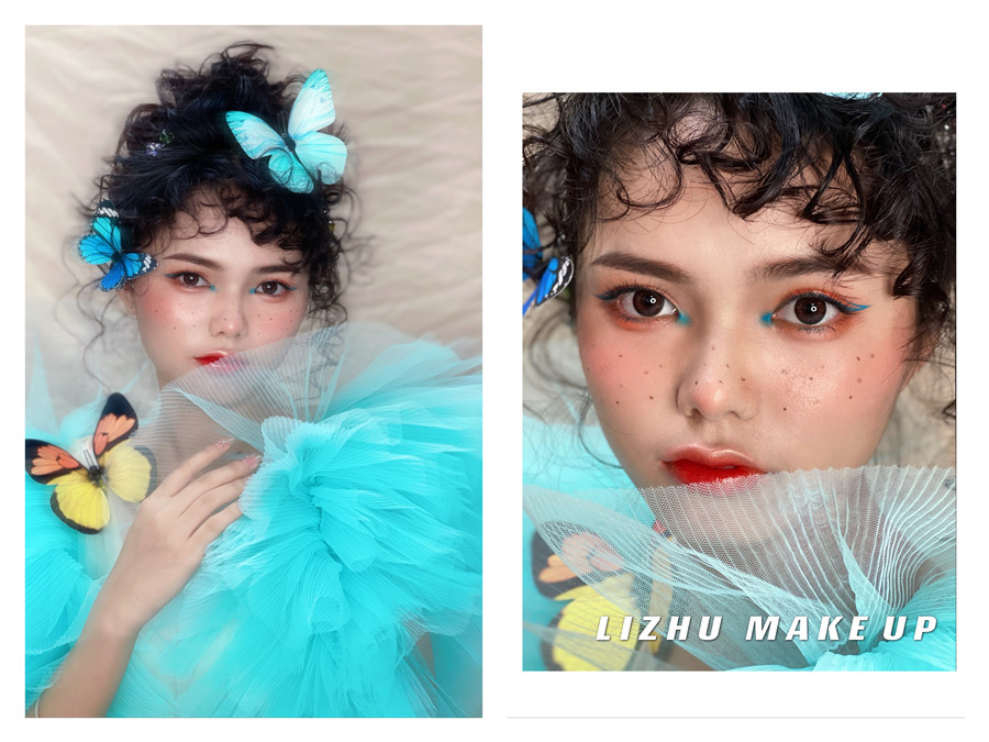 南寧彩妝學校作品分享---個性寫真制造型:蝴蝶頭飾與羊毛卷發(fā)型的組合,搭配今年大火的雀斑曬傷腮紅妝容,將嬌羞與純美展現(xiàn)無遺,甜美如晨間綻放的花蕾。
