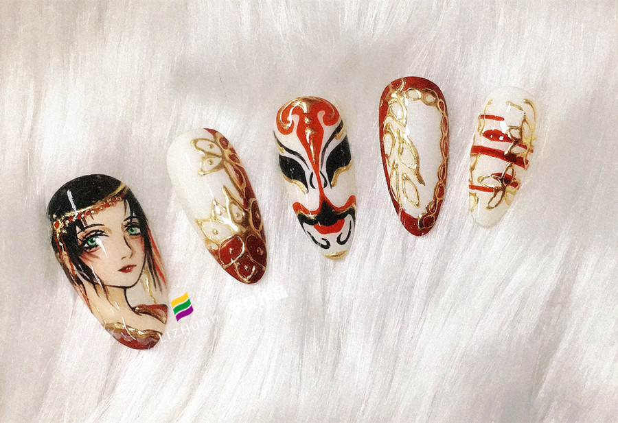廣西美甲師培訓(xùn)班-彩繪卡通美甲:以金黃色和中國(guó)紅為主的色彩基調(diào),運(yùn)用細(xì)膩流暢的線(xiàn)條勾畫(huà)翩翩起舞的舞者,以及國(guó)粹臉譜形象,再加上金邊點(diǎn)綴的花朵,好一副歌舞升平的盛世景象。喜歡挑戰(zhàn)高難度繪畫(huà)的小可愛(ài)們,可以挑戰(zhàn)這款哦!