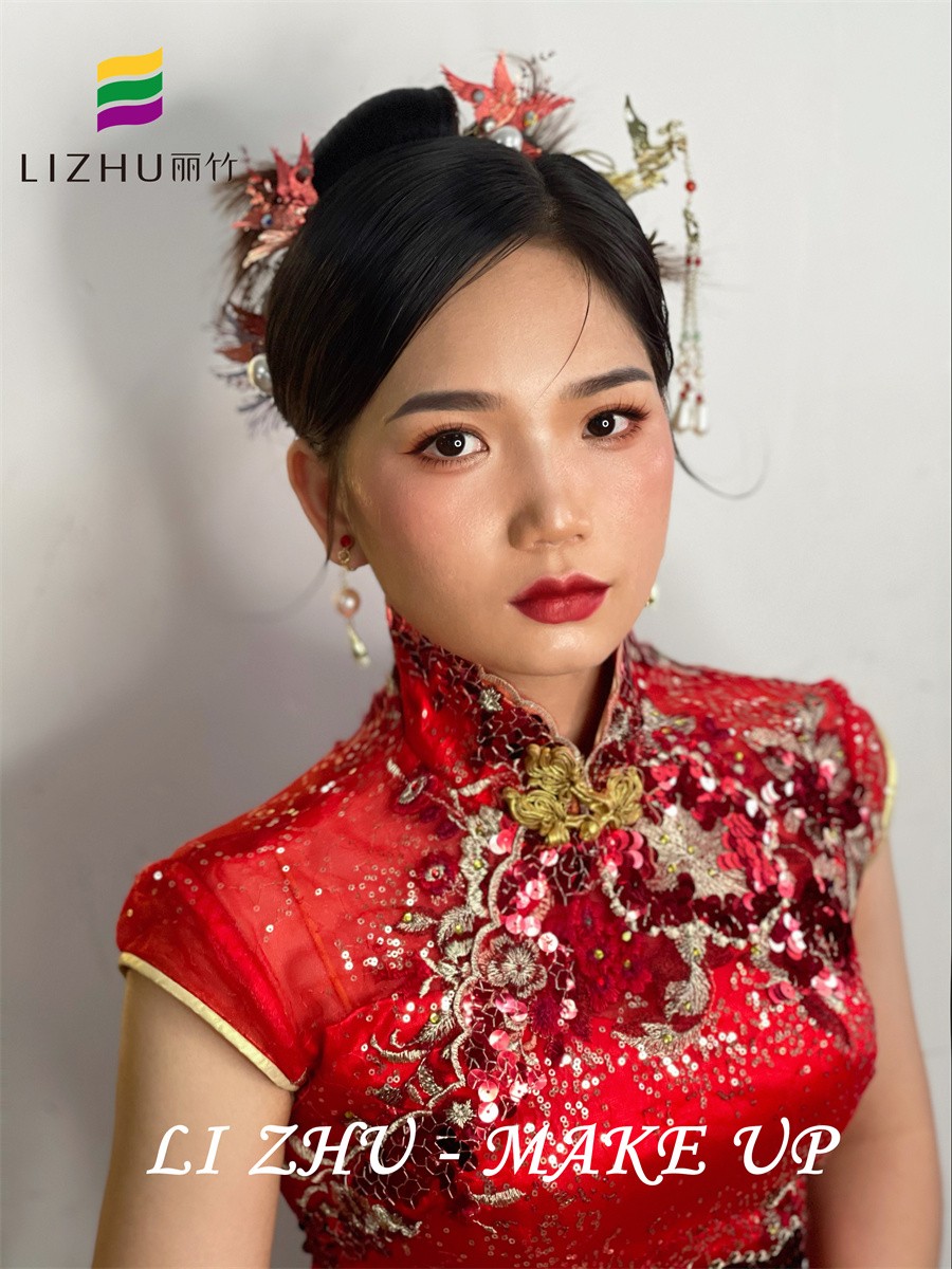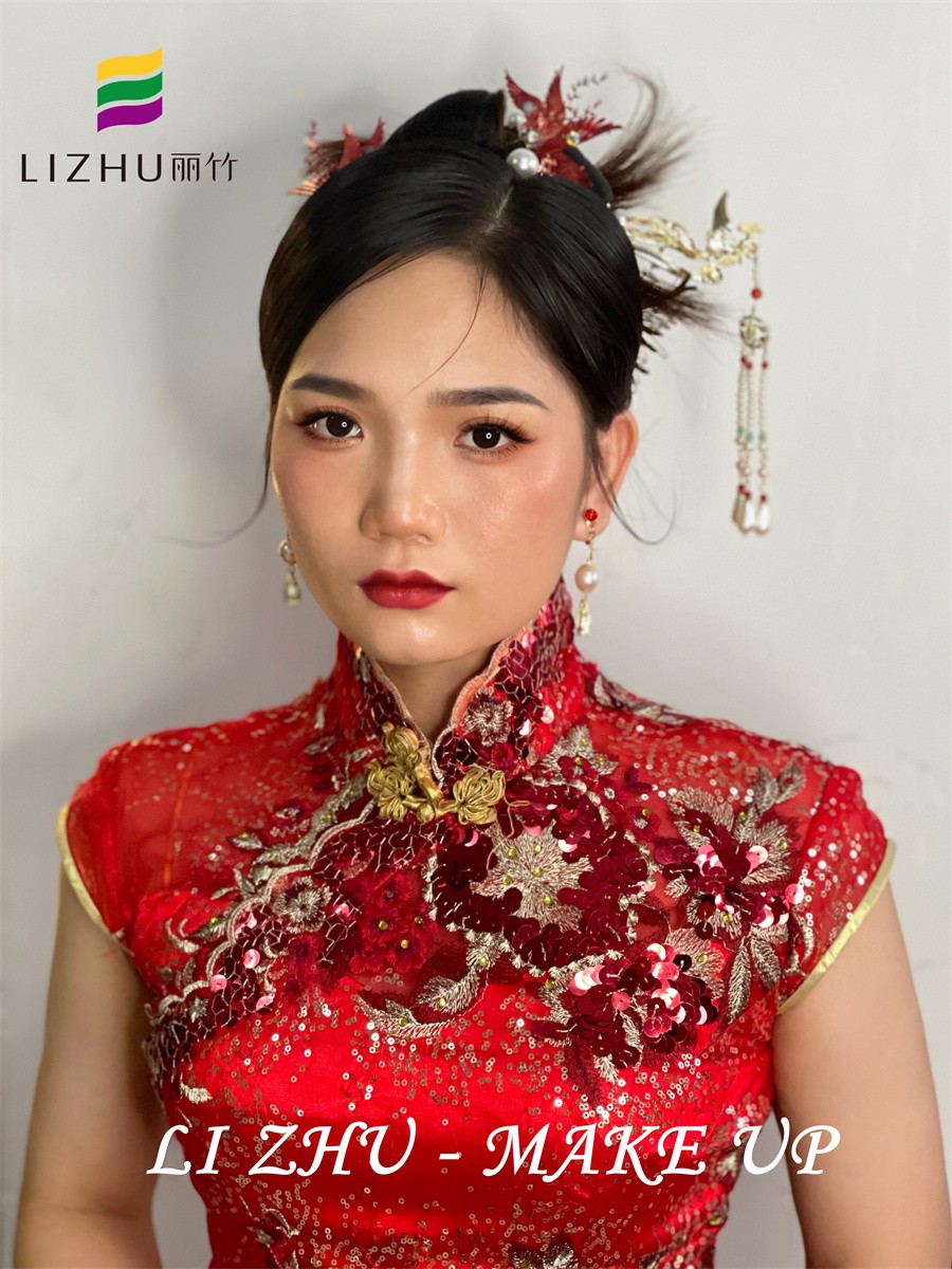 南寧新娘妝培訓(xùn)學(xué)校、南寧新娘妝教得好的培訓(xùn)、南寧新娘妝培訓(xùn)班作品---新娘敬酒造型:簡(jiǎn)潔大方的高發(fā)髻盤(pán)發(fā),耳邊靈動(dòng)的抽絲碎發(fā),輪廓感極強(qiáng)的絹花發(fā)飾,配搭大氣優(yōu)雅的珍珠耳飾,與紅色亮片刺繡相互呼應(yīng),更能襯托新娘貴氣喜慶的氣質(zhì)。如果你也想在南寧學(xué)新娘妝,或是想知道南寧學(xué)新娘妝的學(xué)校有哪些?歡迎到麗竹學(xué)校參觀試聽(tīng)。