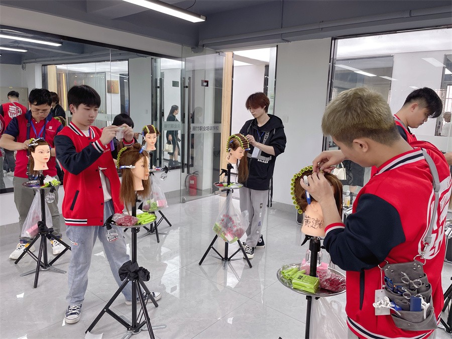 燙染技師班進(jìn)行標(biāo)準(zhǔn)杠頭模上杠練習(xí)