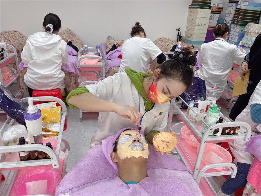 南寧學(xué)面部皮膚管理、南寧美容培訓(xùn)面部護(hù)膚:提起面部補(bǔ)水,想必大家都會(huì)選擇通過敷面膜去給肌膚補(bǔ)充水份和營(yíng)養(yǎng)。其中,相對(duì)于其他類型的面膜來說,敷軟膜粉清潔和補(bǔ)水效果則較為明顯。 而現(xiàn)在南寧美容皮膚管理學(xué)校(麗竹皮膚管理全科班)的同學(xué)們正在進(jìn)行敷軟膜粉的真人實(shí)操練習(xí),就讓我們?nèi)ヂ犅牽捶筌浤し鄣暮锰幇桑?br/>
