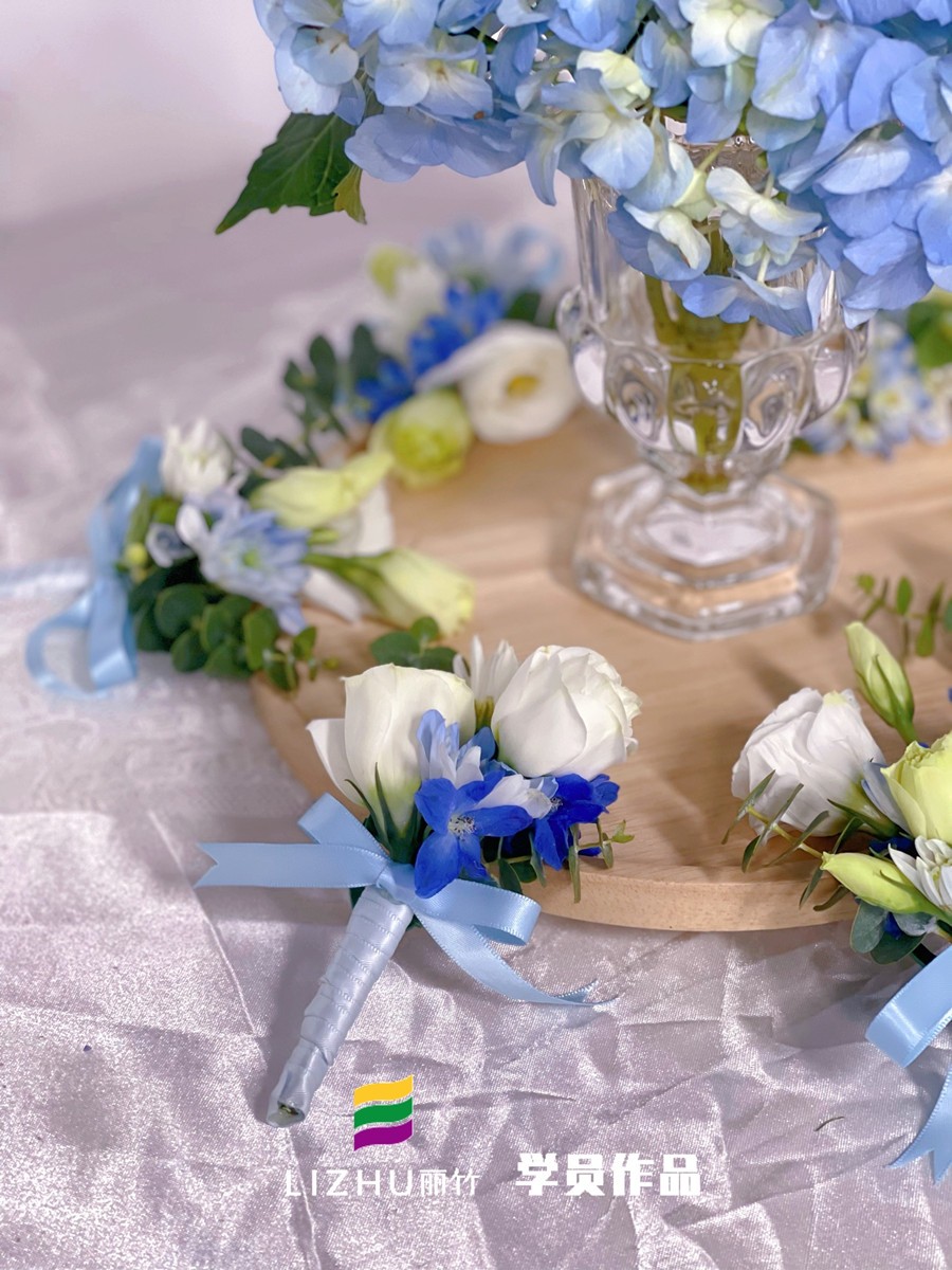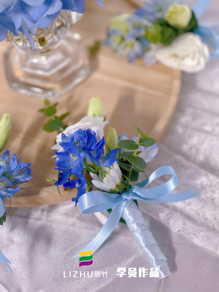 而在剛結束的南寧花藝學校-麗竹花藝學校胸花課程上,學員們根據現有的花材制作了藍色清新胸花,和我們一起聽聽她們制作的方法吧!