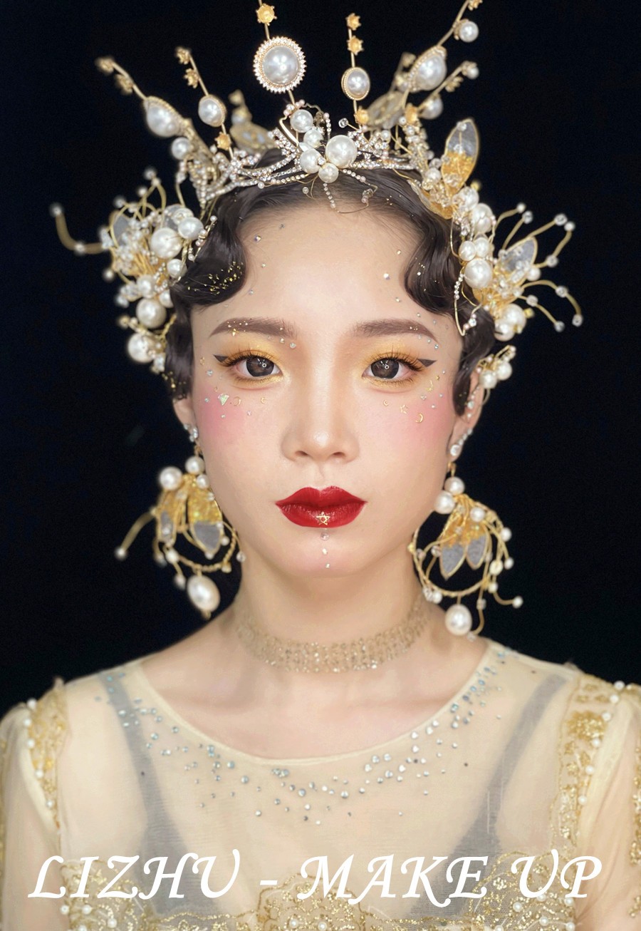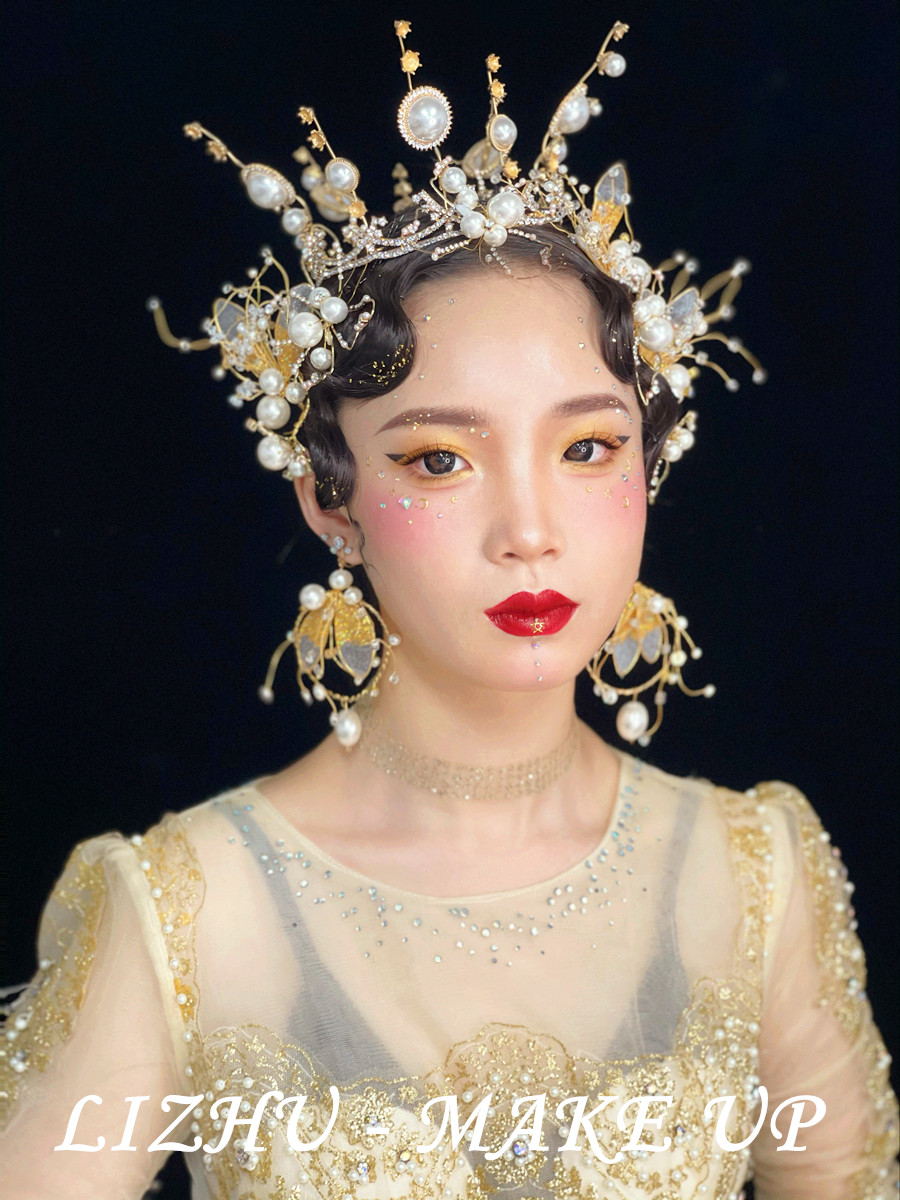 廣西彩妝創(chuàng)意培訓(xùn)學(xué)校作品欣賞:復(fù)古手推波高聳發(fā)髻,金黃高奢珍珠碎鉆發(fā)飾點綴,佩戴同款奢華大氣耳飾,烈焰紅唇襯托大氣底妝,金屬亮片飾品裝飾整臉妝容,身穿重工釘珠打造禮服,氣場強(qiáng)大的高奢妝容造型映入眼簾。