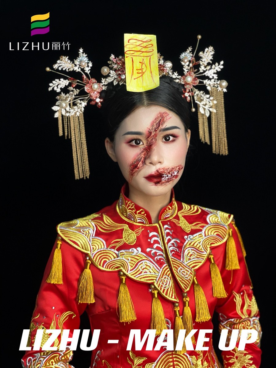 妝面完成,在換上中式嫁衣以及金叉步搖,好一個鳳冠霞帔的中式鬼怪新娘造型誕生啦~初看驚悚無比,細看感覺就是鬼怪新娘本娘,要是在深更半夜看的話,會覺得很嚇人。不得不說,廣西化妝造型學校(麗竹化妝培訓)老師的化妝技術(shù)真的是的呢!