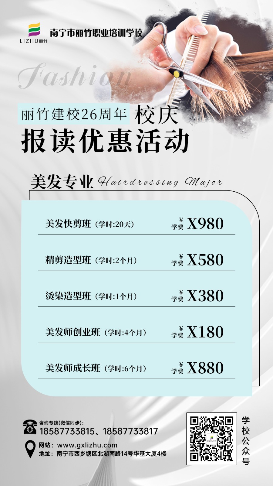 南寧女發(fā)造型、南寧理發(fā)剪發(fā):南寧剪發(fā)造型學校(麗竹剪發(fā)造型學校)接下來就為大家分享兩種常見的南寧剪發(fā)培訓的內(nèi)容---女士發(fā)尾修剪方法。麗竹學?,F(xiàn)在正在進行學費報名優(yōu)惠活動,兩種不同內(nèi)容的活動,相信總有一個適合你。所以,想學美發(fā),就趕緊報名吧!