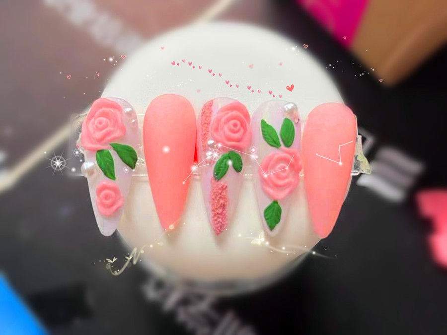 以粉色作為整副美甲作品的主要色調(diào),粉白色作為次配色調(diào)。之后用雕花膠捏出粉色的玫瑰花瓣,然后在捏出綠色的葉子進行襯托。為了增加整副作品的氛圍感,任意在有花瓣的甲片上粘貼大小不一的珍珠飾品進行點綴,將浪漫,甜美的感覺拉到蕞大值。