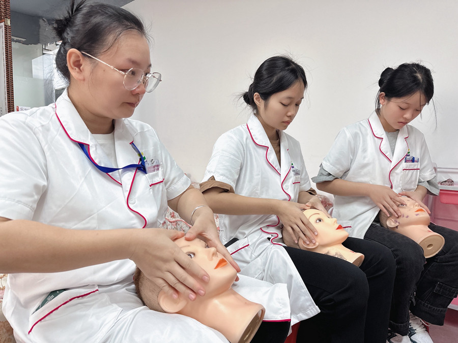 想要學(xué)好面部護(hù)理,通過使用假頭模去熟悉一些面部知識以及操作技巧極為重要!皮膚生理結(jié)構(gòu)知識,頭面部護(hù)理重 點(diǎn)位置分布認(rèn)識,面部護(hù)理準(zhǔn)備工作(消 毒、包頭、洗臉、卸妝等),以及面部按 摩手法教學(xué)(中式)等。