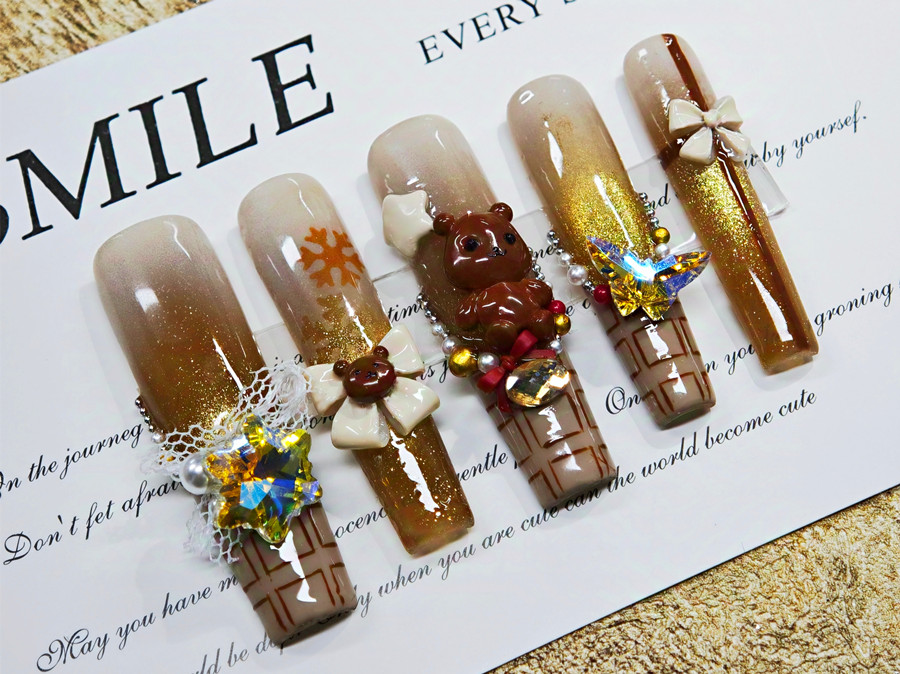 使用雕花膠慢慢揉搓出小熊身體的哥哥部位,然后在慢慢拼湊,描繪上喜歡的圖案和顏色,一個(gè)活潑可愛(ài)的細(xì)心立體卡通形象就完成了。之后在點(diǎn)綴一些蝴蝶結(jié),珍珠,鉆石等亮閃閃的飾品,甲片也在金屬膠與暈染甲面的相互映襯,變得星光熠熠。這樣一款極具童趣有精致感滿滿的巧克力熊雕花美甲就完成啦!