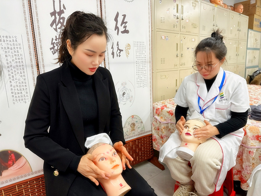 南寧皮膚管理護膚班同學(xué)跟著老師在假頭模上進行手法練習(xí)