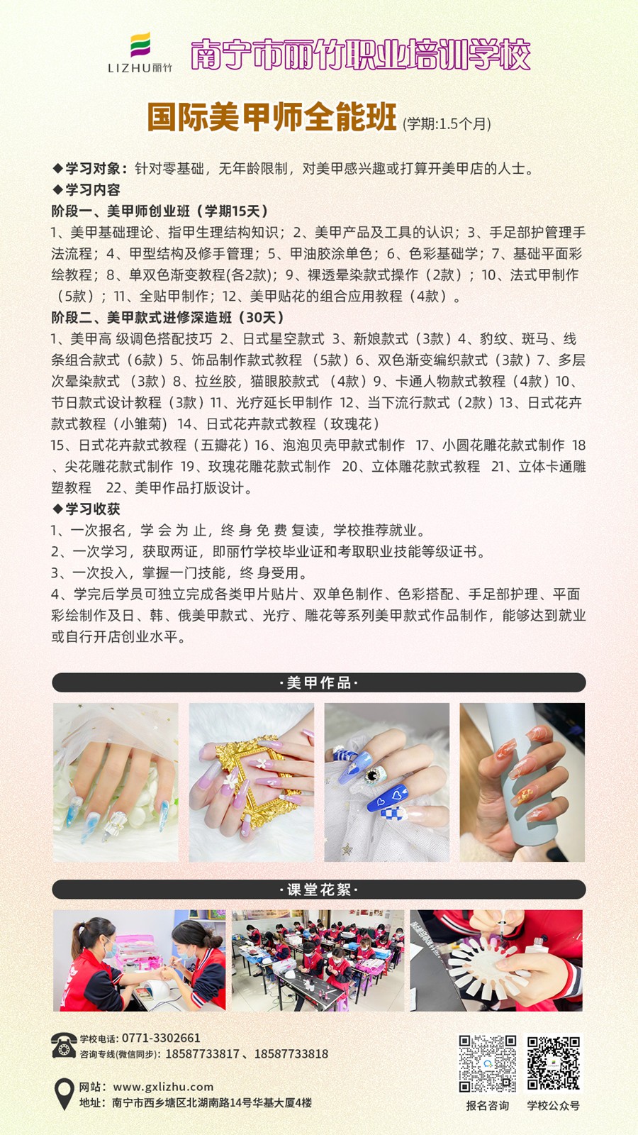 如果你本來(lái)就對(duì)美甲技術(shù)感興趣,或是如果你本有美甲基礎(chǔ),只想找一家專業(yè)美甲學(xué)校提升美甲技術(shù),那么不妨到麗竹麗竹學(xué)校美甲進(jìn)修班看看吧!無(wú)論你是哪種需求,相信我們的招生老師總能幫到你選擇合適的課程。