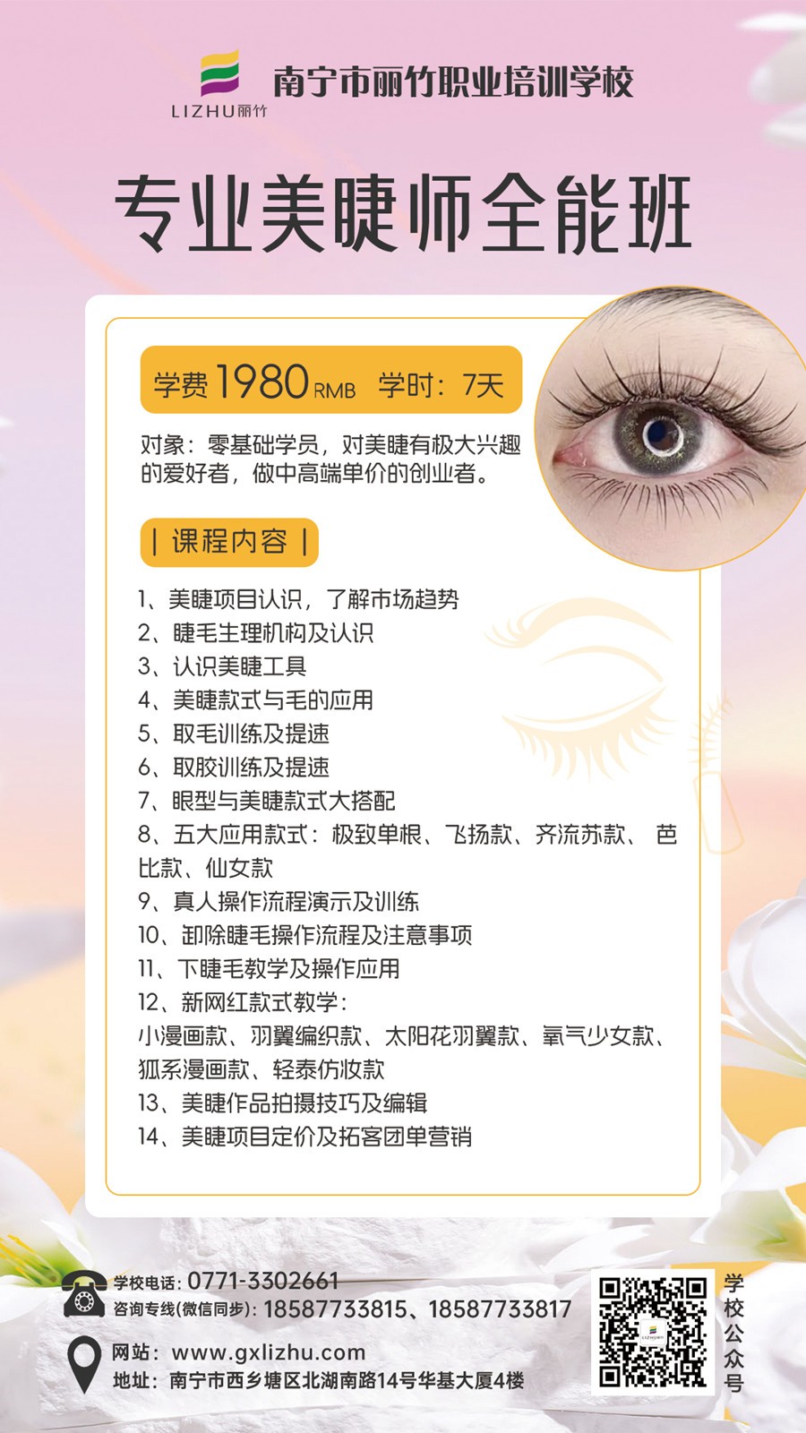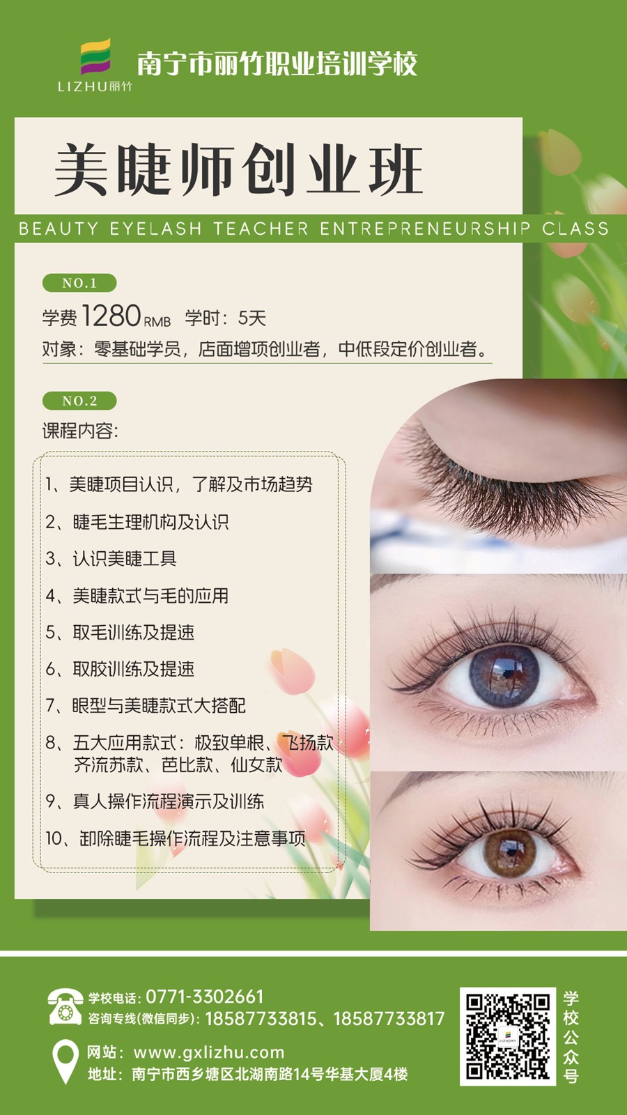 南寧美睫師、零基礎(chǔ)學(xué)美睫:寧美睫培訓(xùn)學(xué)校-麗竹學(xué)校美睫課程教學(xué)技術(shù)成功全面升級!美睫學(xué)費(fèi)優(yōu)惠活動(dòng)持續(xù)進(jìn)行,截止日期為5月30日。如果你想在南寧學(xué)美睫,想做南寧美睫培訓(xùn)學(xué)費(fèi)哪里便宜?那現(xiàn)在就不要猶豫,趕緊聯(lián)系我們報(bào)名吧!拼手速的時(shí)候就是現(xiàn)在。畢竟,你還在猶豫不決時(shí),別人已經(jīng)開始行動(dòng)了。
